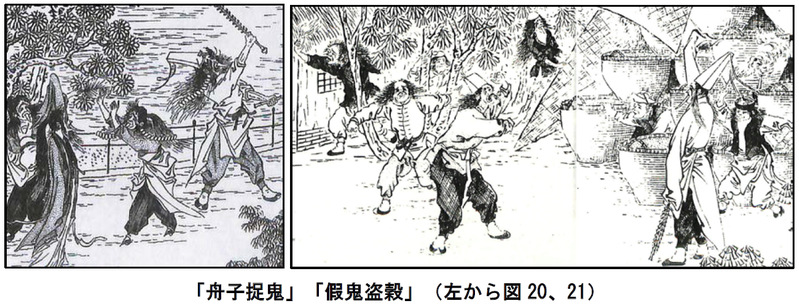 言うまでもなく、[○●]を示すためには、強盗の数は2人以上が必要となるが、複数人による犯行ならば[○●]を示すのかといえば、そうでもなかったようだ。例えば、「舟子捉鬼(船頭が幽鬼を捉える)」(図20)、「假鬼盗穀(偽幽鬼が穀物を盗む)」(図21)という記事がある。