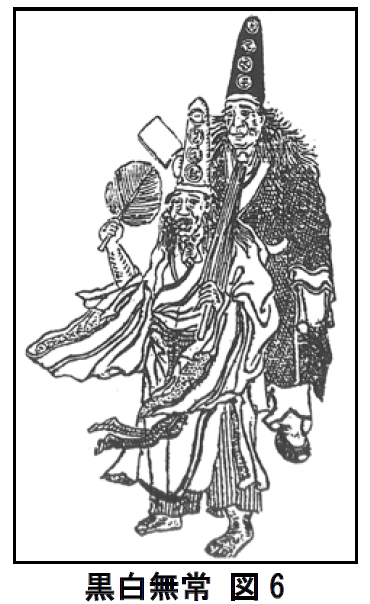無常鬼に白無常と黒無常の2種類があること、白無常と黒無常はペアであること、これらの示唆・指摘は、無常鬼関連の言説においては常套句となっており、両者の関係を二元性の対応関係と解釈する論者も少なくない(その際にしばしば使用される挿図として図6がある)。