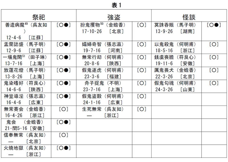 さしあたり全体の累計に着目したい。[○●]は過半数以下の9 件にとどまり、残りの13件を[○]が占めることとなった。再三述べている通り、およそ[○]を示す記事は「無常鬼=[○]」の図式に該当した。また、本表において[●]が一例も確認されないことにも注意したい。これらの諸条件を綜合すると、白無常は単独で存在し得たが、黒無常は白無常の存在を不可欠とする、白無常ありきの存在だった、と結論付けることができよう。