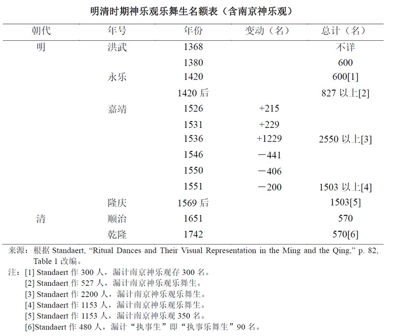 神乐观额定乐舞生人数,历朝不一(参见下表)。据《太常续考》,洪武十三年前后,额设乐舞生六百名,“内选声音洪亮、礼度娴熟者,分为典仪、通赞、掌乐、教师”。永乐朝迁都北京时,存留一半于南京,另三百名前往北京,后“续添至五百二十七名”。至嘉靖朝,随着礼制改革的进行,乐舞生的数量也有大幅度的增长。嘉靖五年(1526),世庙添二百一十五名;十年(1531),建太岁神祗坛,添二百二十九名;十五年(1536),建九庙,添一千二百二十九名,至此共有乐舞生二千二百名。其后经嘉靖二十五年(1546)至三十年(1551)的几次裁革,最后,乐舞生人数大体固定在一千一百五十三名左右。必须指出,这个数据应该只是北京神乐观乐舞生的名额,南京神乐观的三百五十名乐舞生尚未计入。清朝入主中原后,重定乐舞生名额。顺治元年,定神乐观乐舞生五百七十名。乾隆七年后定为四百八十名。