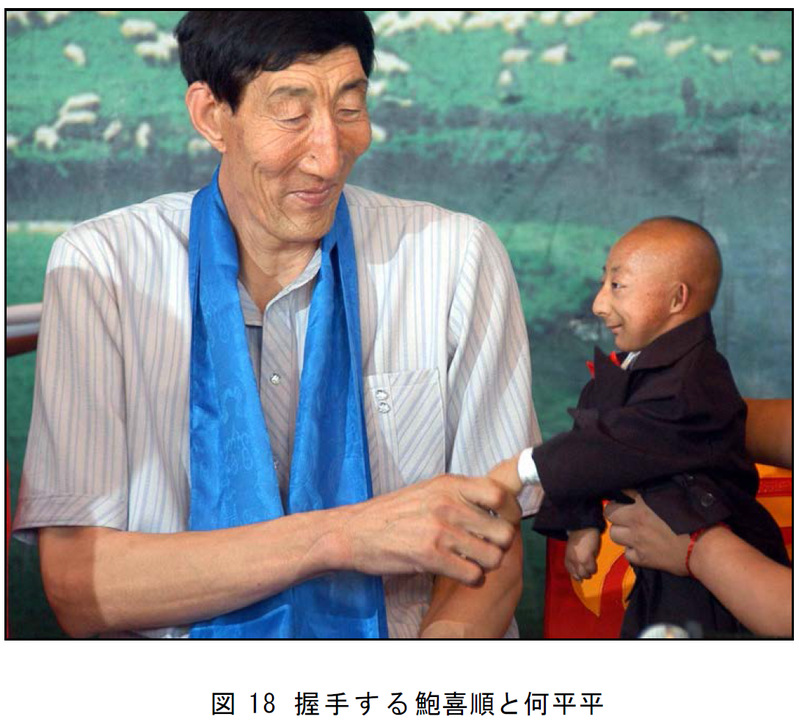 このニュースは中国でも一時話題となったようで、鮑喜順と何平平の対面の席が設けられることとなった。下掲の写真(図18)に収まるのは、その時、2人が握手を交わした瞬間である。ここに成立した巨人と小人の一対の関係は、おそらく現代の中国人によってごく自然に発想され、また享受されたものと考えられる。両者が一対となることそれ自体に驚きを見せた清末の人々との径庭は改めて述べるまでもない。世界一の巨人と小人の対面を企てた現代中国人の観念は、実はたかだか100年程の歴史性に支えられたものだったのである。