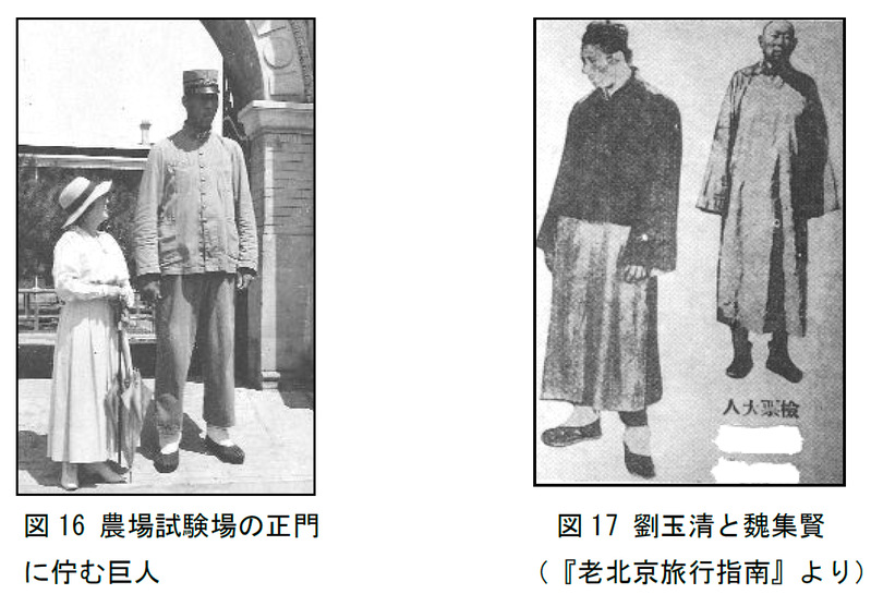 初代の劉玉清の渡米については、1926年に発表された魯迅の「馬上支日記」や、1926年3月14日付けの『北京日報』の記事にも記録が残っている。また、馬芷庠著・張恨水審定『老北京旅行指南』には、チケット検札員(該書では「檢票長人」とされている)を務めた2人の巨人の絵が掲載されており(図17)、王煒、閆虹『老北京公園開放記』にも同一の絵が掲載され、2人の名が劉玉清と魏集賢であることが明らかにされている。