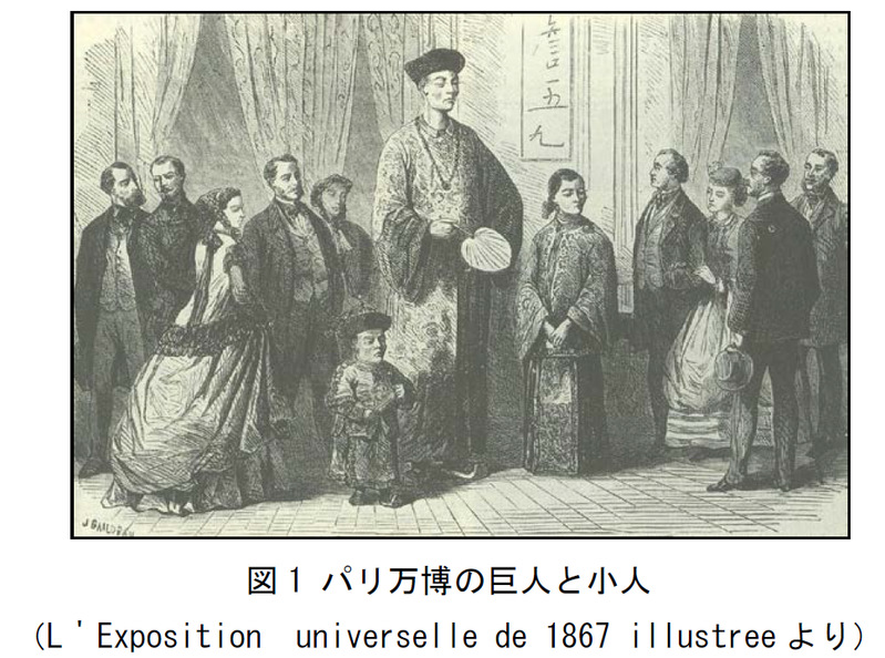 下掲の絵(図1)は、1867年に開催された第2回パリ万国博覧会における中国館の様子を描いたものである。絵中央に見えるのは、異様に大きな、そして異様に小さな、2人の中国人男性の姿である。彼等は、旁らに中国人女性を伴いながら、双方の身長異常を際立たせるかのように並立し、周囲の西洋人の視線を集めている。