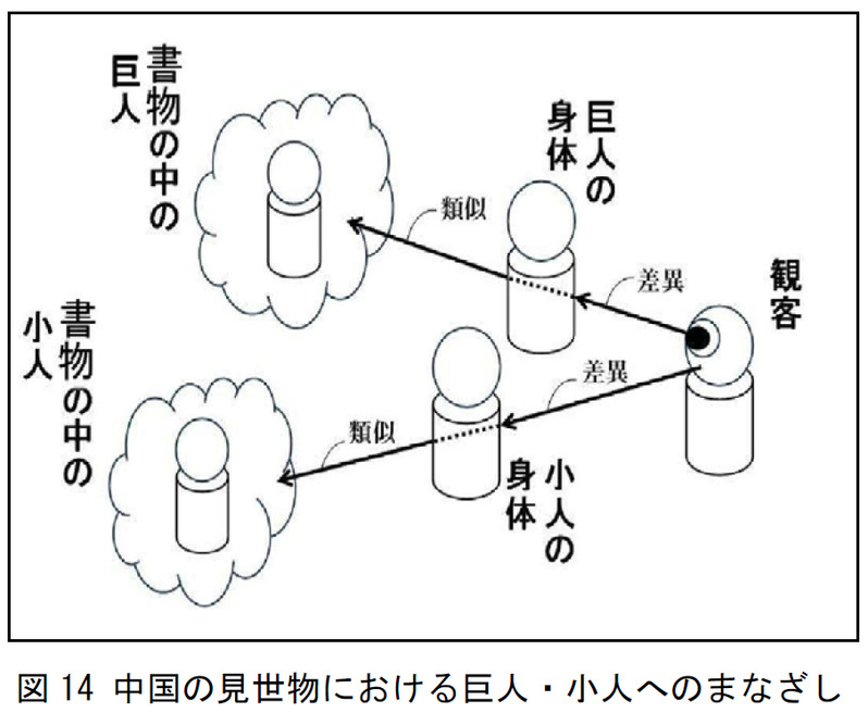 ただし図14に示した通り、清末の人々もまずは巨人・小人の身体をまなざしの対象とした。つまりここでは正常な身体との差異に基づく比較が行われる。ところが、「観客―巨人」「観客―小人」の差異性が認識されながら、「巨人―小人」の比較が行われることはない。なぜなら、認識された(正常な身体との)差異をもとに、次の段階として類似に基づく比較が開始されるからである。「眼前の○○は、△△に記された××である」といったように、認識の絶対的な拠り所となる書物の存在によって、彼等の視線は眼前の巨人・小人の身体を通り抜け、最終的に書物中の巨人・小人に行き着く。