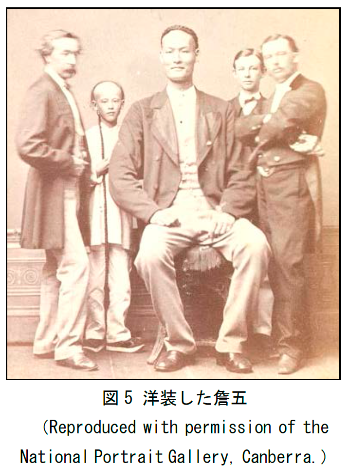 傍線部(A)では、「外国の巨人」を一目見ようと集まった中国人たちが、その正体が詹五であることに気づき、酷く落胆する様子が記されている。傍線部(B)では、西洋かぶれの詹五の高飛車な様子が悪意に満ちた筆致で描かれ、詹五がただ背が高いだけの無能であることを皮肉って文章が閉じられている。その他の詹五を報じた記事と併せて見るに、どうやらこれが当時の中国人の巨人詹五に対する標準的なスタンスだったようである。そして詹五をめぐる記事は、しばしば彼の洋装について触れている。右掲の写真(図5)には、洋装した詹五の姿が見える。