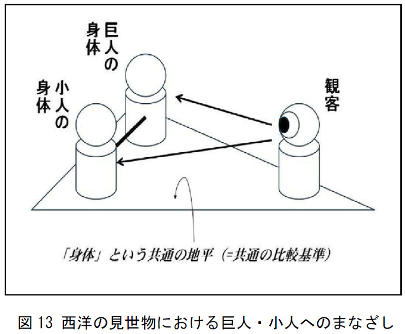 ここにおける「身体」という基準に特化した一元的体系は、巨人と小人に「共通の地平」(=共通の比較基準)を与えることとなる(図13)。この条件のもとにおいて漸く巨人と小人は比較対象となるのである。