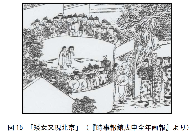 その痕跡が、『申報』や『点石斎画報』の記事から下ること凡そ30年、1909年に発行された『時事報館戊申全年画報』の「矮女又現北京(小人女また北京に現る)」(図15)という記事に残されている。
