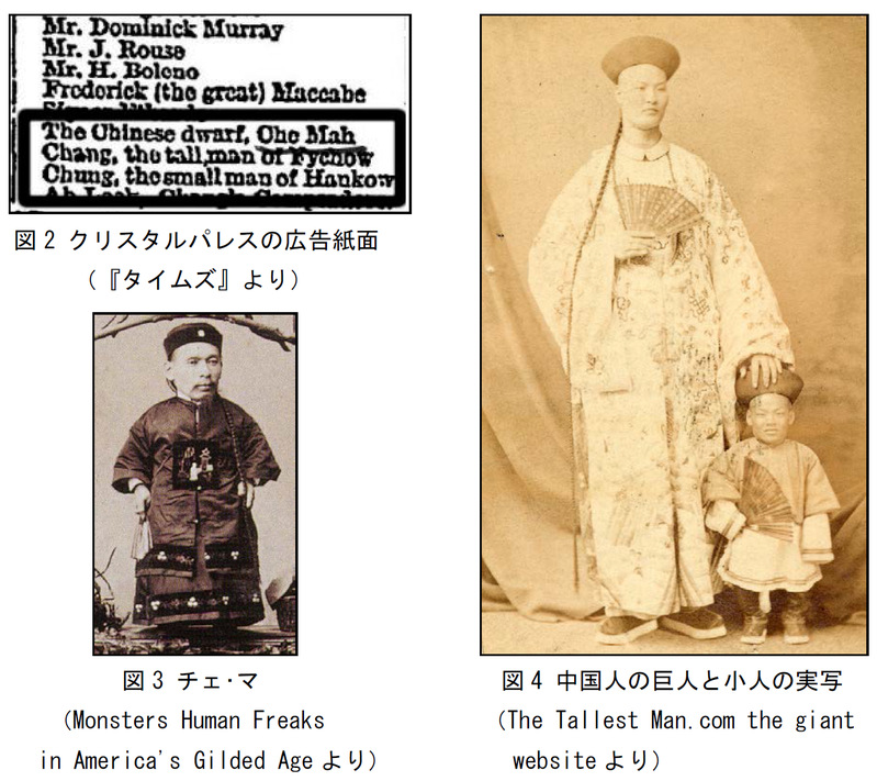 また、鹿島氏が引用したデュキュアンのコメントも些か事実と異なるように思われる。というのも、画中の巨人は万博の数年前より既に西洋において、しばしば小人とコンビを組まされ見世物となっていた人物だからである(第1章にて後述)。当時において巨人・小人を見世物とする観念は、中国ではなくむしろ西洋にこそ根付いていたのではないだろうか。