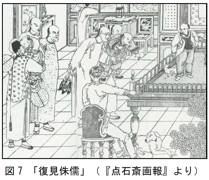 ちなみに、西洋人の小人を売り物にした見世物については、他に「復見侏儒(再び侏儒現る)」(図7)という記事がある。テキスト部分によると、この小人はイタリア人であるという。絵を見ると、「僬僥遺種」と同様に、小人をしげしげと見つめる人々の姿や、香具師風の男(西洋人か)が描かれている。どうやら小人を見世物にするというまなざしに、洋の東西に径庭はなかったようである。