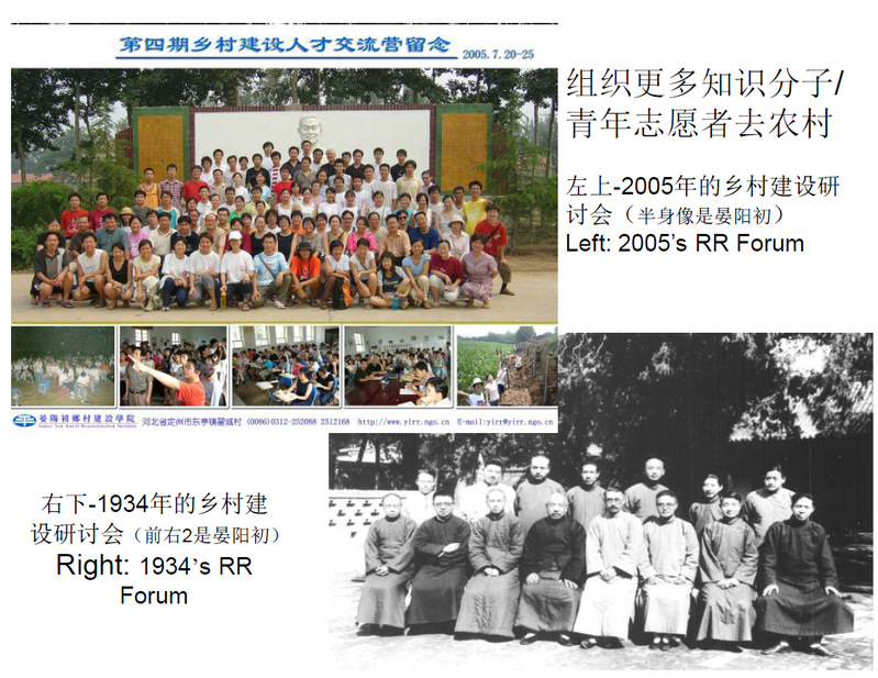 这些引述只是告诉大家,如果我们看百年的乡村建设,也是伴生着一个非常复杂的中国形成国家主权的条件以及这个主权变化的过程。早期的清末民初,也就是说清朝所形成的传统国家政权解体,而民国试图照搬西方国家政权体系尚不能成立的阶段,恰恰是礼崩乐坏,乡村社会一片衰败。在这种情况下,有以实业救国,或者是以教育救国,或者是以科技救国的主流,但是这些救国论基本是自上而下;主张平民化的乡村建设恰恰是自下而上。