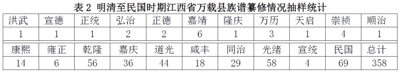 任何文献都有其时代性。这里所说的时代性,一方面表现为单一文献的版本,另一方面则表现为某一类文献集中纂修于某一时期。以地方志为例,明清时期是中国地方志纂修的高峰时期,单独一部县志的前后历次纂修,多者有达十余次者。另一方面,就方志这种文献类别来说,其修撰的时间又是比较集中的,清代方志大多集中在康熙、乾隆、道光以及同治、光绪几个时期(参见表一)。修志集中于特定的时段,表明竞相修志已然成为一时的风气,体现出具有“大历史”意义的时代性特点。这种文献的时代性,也同样反映在明清以来的族谱纂修中。江西万载县清代以来纂修的族谱,截至2006年散见于公共图书馆的就有270种。根据笔者对万载族谱谱序编年的粗略统计,总共358次的纂修,清中叶以及清末和民国时期是族谱编纂比较集中的时期(参见表二)。梁洪生对辛亥前后江西族谱反映出的社会变迁的研究,充分体现了清末民初时期所修族谱的时代性。本文以江西万载县高村山湾李氏宗族纂修的族谱为例,结合文献产生的地域场景和地方社会历史脉络,力图揭示出族谱文献与时代大历史之间的关系。