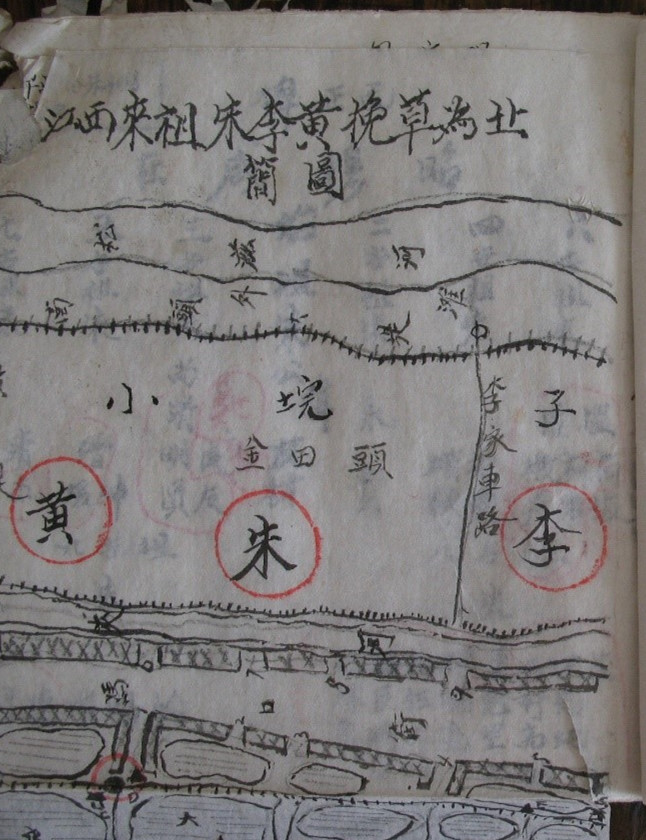 这样的解释当然没有错,但若将朱李黄三姓与冯口之间的关系分为上、下两章的话,上述说法只揭示了其中下半章的情形。追根溯源,朱李黄三姓与冯口间的对应关系与三姓在冯口地区早期开发中的协作围垸有直接关系。对此,《紫阳堂朱氏家谱》有较清晰的记载。今见《紫阳堂朱氏家谱》是朱氏族人朱笛田在对原谱记忆和理解的基础上重新手写,该谱《谱序》称:“明朝末年,吴三桂反明,初封西平王,镇滇南,朝廷腐败,处处兵荒马乱,明崩毁,株灭九族。江西填湖北,湖北填四川。朱祖朱友材与舅姨朱李黄三老表,以江西佳诚县梨树乡来到湖北枝江百里洲,挽草垦荒,堵口开垸。”由此可知,朱、李、黄三姓本是姻亲,据族内老人讲,朱、李、黄中,朱是姑爹,黄是舅爷,李是姨爹。他们是明末清初战乱中较早迁到冯口一带的移民,在这里“挽草垦荒,堵口开垸”,对战乱遗留的荒地进行了最初的开发。谱中所载朱李黄三姓“挽草为业”图(参见图3),非常明白地绘出了朱、李、黄三姓的地界和与冯口街的相对位置:
