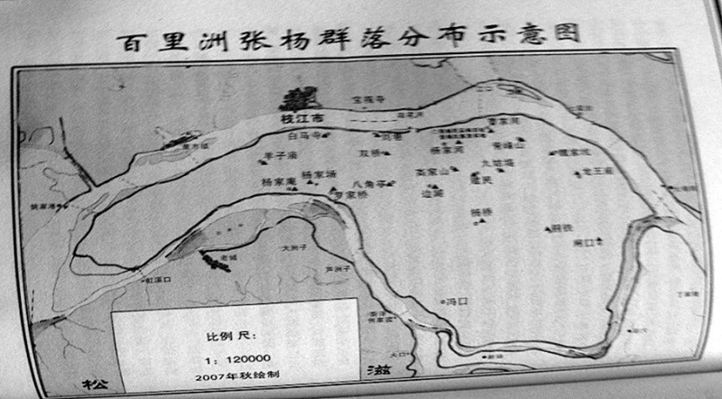 在张杨家族发展过程中,张杨家族的生存空间也不断拓展。据族人考证,肇之公当年落足百里洲的“丹阳上百里洲仓前”,即现今百里洲的杨家河村,它是张杨家族的发祥地。诚如族人所言,张杨祖先的开基创业是一步步地迈出,一处处地拓展的。在六百多年的发展历程中,除迁往洲外董市、顾家店镇,沙碛坪,马家店,江口以及宜昌、长阳等县市的族人外,洲内族人的拓展,基本是由北向南,呈扇面展开,这种拓展,恰好展示了张杨族人在环洲大题的保护下,由北部高地向湖泊港汊深处延伸的轨迹。