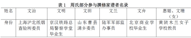 民国十一年(1922),时任陆军军法监的周仲曾和他的两个同为法官的儿子——周文冕、周文冠以及其他家族精英共同编纂了一部颇具时代气息的家谱。据周文冕在其所撰的序文中指出:“严君官京师,虑先德不传,将遗后憾。官书之暇,蒐集旧存墨谱及现有资料,手自纂修。不肖兄弟肄业京校,时于课余从事缮校,今已数载,得庆成功。”由此可见此次纂修家谱,仲曾、文冕、文冠父子三人是积极参与并倾注了大量心血。谱序中即注明周仲曾为督修,而其他编辑与缮写者分别有如下若干关键性人物,兹列表如下: