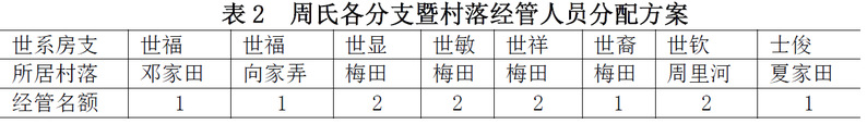 以上经管人数共计12人,分别来自梅田村、邓家田、向家弄、夏家田、周里河五个村落,其中梅田村最多,占据了7个席位,是有意为之还是无意中形成不得而知。由后面可以知道,周氏宗族事务的处理基本以经管会议为核心,并依“多数人”原则处理,而梅田村占据经管会议12席位中的7位,人数刚好过半,由此也进一步确立了其族姓中心村之地位。其余名额分配为周里河2位,夏家田1位,邓家田1位,向家弄1位,而周家细湾和周家大屋则可能因为人数较少且与众多异姓杂居而一个席位也没有。