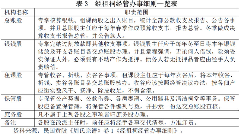 周氏经祖祠内部分设有总账、银钱、租课、保管、庶务五股,各股有一二经管为主任,具体办理宗族各项事务,列表如下: