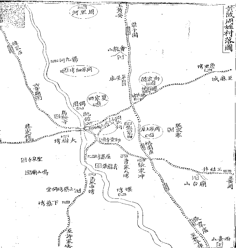 这七个周氏所定居的七个村落,从姓氏构成来看,在村落布局上,似乎处于一种满天星似的分布,而且一般村落规模较小,大约只有20-30户。这可能与黄陂处于丘陵地形,土地较为贫瘠,土地承载量有限,村庄规模一般不大,所以随着人口繁衍扩张而不得不外迁。周氏宗谱在记叙里居情形时就曾分析其原因曰: