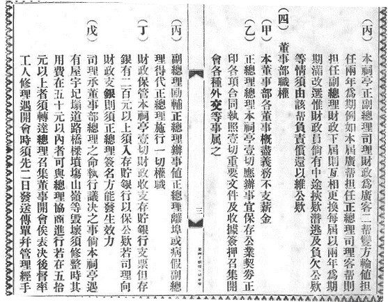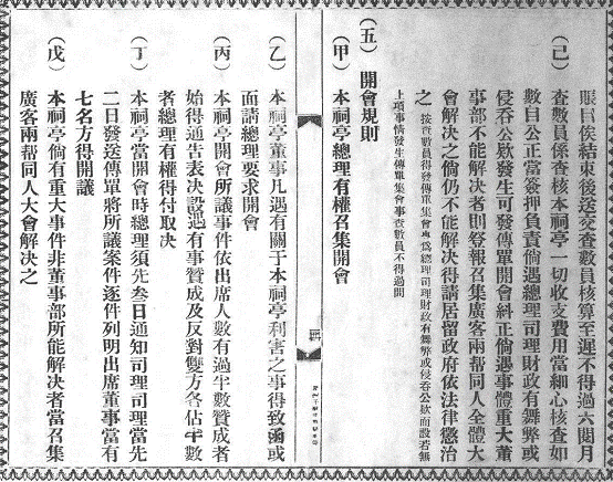 关于董事部的组织方式,章程规定“本亭祠设二十人,计广惠肇十名应和馆五名,五名丰永大公司五名组织之”。“由本董事部二十名内推正总理、副总理、财政、司理各一人、查数两人。其余概为董事分任各项职责”。