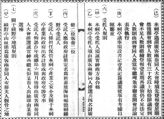 综上所述,经过19世纪末到20世纪初的发展,绿野亭在社群整合的基础上于1920年代建立制度化的组织架构和规范化的管理系统。1927年颁布的首部章程,总结与确认了绿野亭在新加坡社会脉络下所历经的一百年的社群整合与制度化发展的成果,亦为该帮群总机构在20世纪的演化提供了一个重要的纲领性文件。