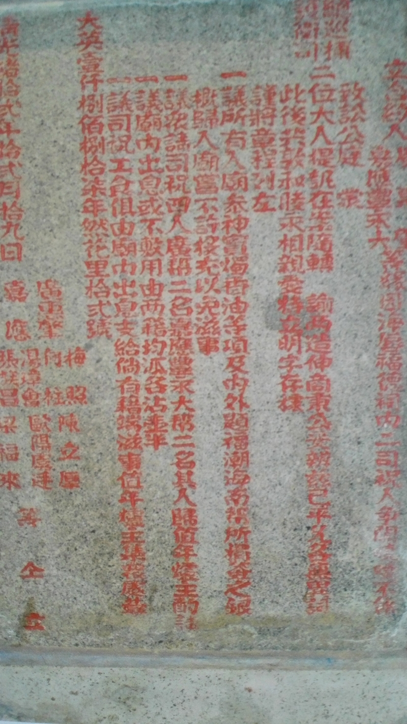 一议所有入庙参神宝烛香油等项,及内外题福、潮、海南帮所捐签之银,一概归入庙尝,不许投充,以免滋事。