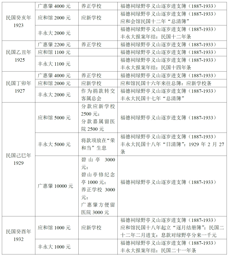 第二、绿野亭所属社团对款项的使用,则显示出绿野亭内部社群认同的差异。“广惠肇”所分得的款项主要用于该社群所属的“养正学校”、“碧山亭坟山”和“广惠肇方便留医院”。而客属的“应和馆”,则用于会馆创办的应新学校。另一客属的“丰永大”,除了用于茶阳大埔会馆兴办的启发学校,也资助客帮总机构客属总会。