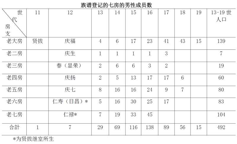 虽然编者指出:“经一年多以来遍及海内外,各方探访搜索,核对资料务求详实。”但从谱系的记载来看,我们不难发现二房和三房登记的人口和世代特别少(参见上表)。五房和七房则有不少资料模糊或矛盾的地方,如五房十四世裕贵公生于同治丙寅年(1866),而其父日承则卒于咸丰戊午年(1858)。十五世朝魁生子文畅,而在十六世文畅则书红魁子。又如第七房: