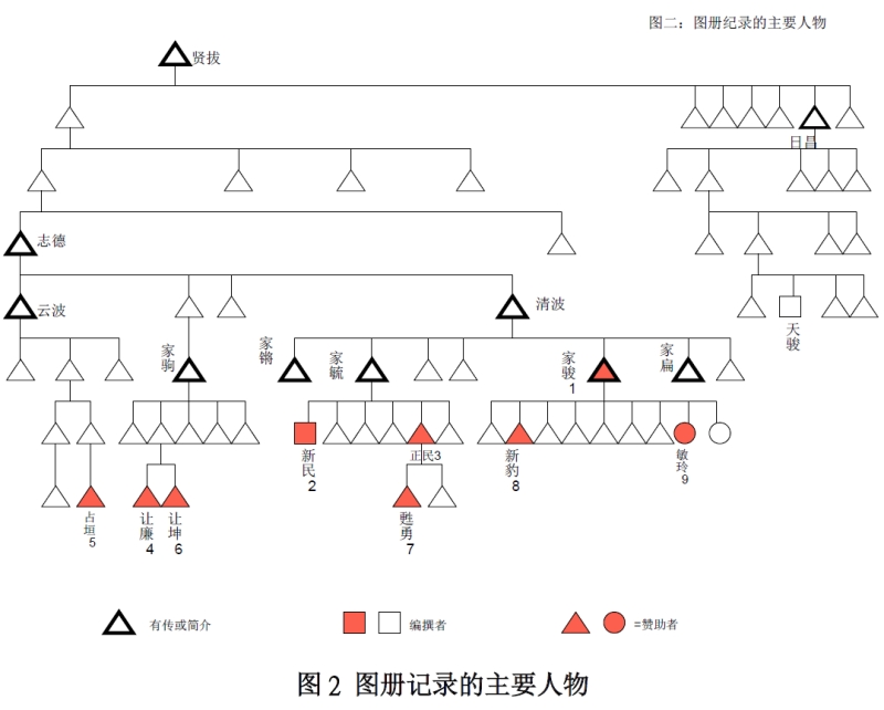 谱系是联系祖宗和子嗣的工具。联系并不需要依赖每一世代所有成员的纪录。就如祠堂内奉祀的祖先、或者墓祭的祖先一样,谱系登录的对宗族有功、有德的成员是有选择性的(参考图3)。也许我们可以问:为何长房志德(1-1-1-1)的父、祖、兄弟没有特别的传记纪录?为何家驹的伯叔有传记纪录而其父亲(1-1-1-1-2)没有?为何其祖父志德有传,其曾祖、高祖和叔祖则没有?也许我们可以假设谱系纪录的,是通过共同祖先来联系不同房支的工具。如(图3)所示,十一世贤拔是联系长房和六房的共同祖先,志德是联系云波、家驹、和清波三支的共同祖先。因此,志德的子孙要和六房联系的话,他们便需要找到一位共同的祖先。假如志德的子孙要和长房其他的子孙有所区别的话,便不需要强调其父(1-1-1)、祖(1-1)、兄弟(1-1-1-2、1-1-2、3、4)的关系。也就是说,谱系有既联系又排他的作用。联系和排他是当代和过去荣耀的选取,因此,强调的是家庭而非无选择的包容的宗族。祖先的作用,是作为联系的接连点。