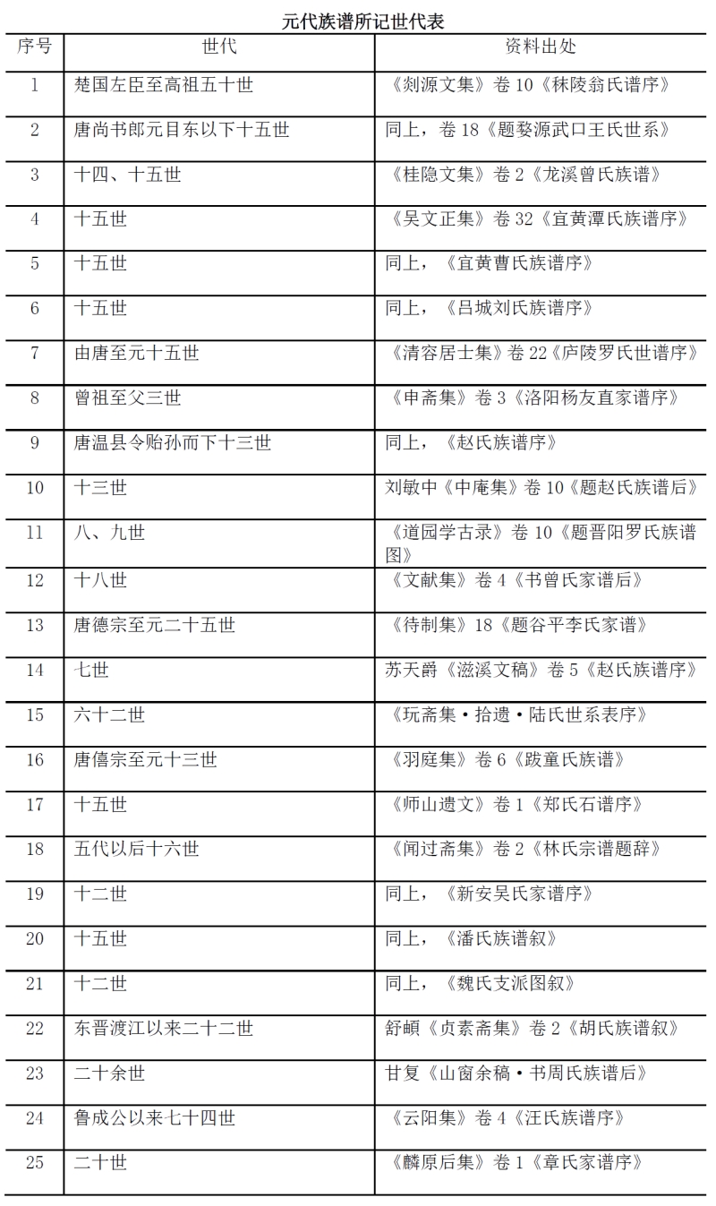 元人主要是把修族谱作为收族手段的,强调将出了服的族人收在一起,他们批评欧、苏特别是苏洵族谱主要记载五服之内族人的收族是“隘”和“薄”,因此,元代族谱必然会有力求追远的世代记载。为了了解元代族谱的世系记载,兹据《四库全书》所收元人别集的谱序中提到的世代数制表如下: