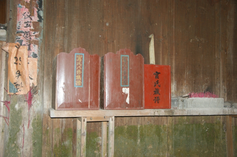 族谱修成时,一般会根据族谱的大小,制作谱箱一只,以便于族谱的收藏,这种箱子被称为谱箱。在雾阁游谱时放在小轿内的,就是这种谱箱。族谱和谱箱摆放的位置,各地略有差异。在宁化县明珠乡明珠村,多半在大厅中堂右侧的空隙内与香案等高处,制作嵌入型的柜子一只,族谱就收藏于这个柜子内。更常见的做法是,将谱箱放在紧挨中堂的香案上,宁化县水茜乡沿溪村宁氏的香火堂就是一个例子,这个宗族的三部族谱,都摆放在香案的右侧(见图五)。在连城四堡地区,也多半采取这种摆放方式。我们知道,在一座房屋中,大厅具有核心的位置——这是举办家中婚丧仪式的处所,而在大厅中,中堂和香案占有非常重要的位置,与家中仪式活动的关系甚为密切。香案不仅摆放族谱,而且供奉神明和神主牌,而紧挨着香案的中堂,是春节期间悬挂祖像的所在。