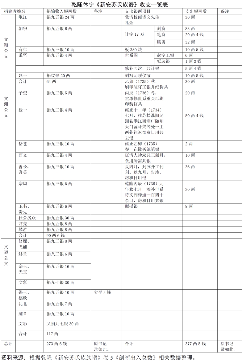 一部族谱从编修到最后刊刻完成,其花费的资金是十分惊人的。下面,我们仅以乾隆休宁五卷本《新安苏氏族谱》为例,具体说明清乾隆年间徽州族谱的编纂和刊刻的收支情况。