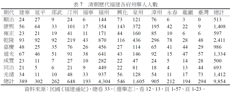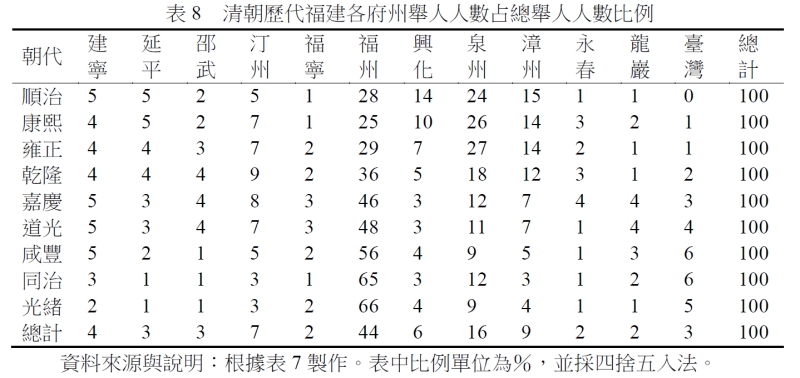 清代閩北科舉情形,筆者根據民國《福建通紀》內的〈選舉志〉,將清朝歷代福建各府州進士、舉人人數及其占總人數比例,製成表5、表6、表7、表8: