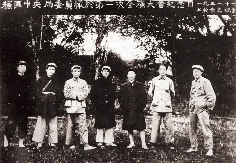 1931年苏区中央局部分委员合影,左起:顾作霖、任弼时、朱德、邓发、项英、毛泽东、王稼祥