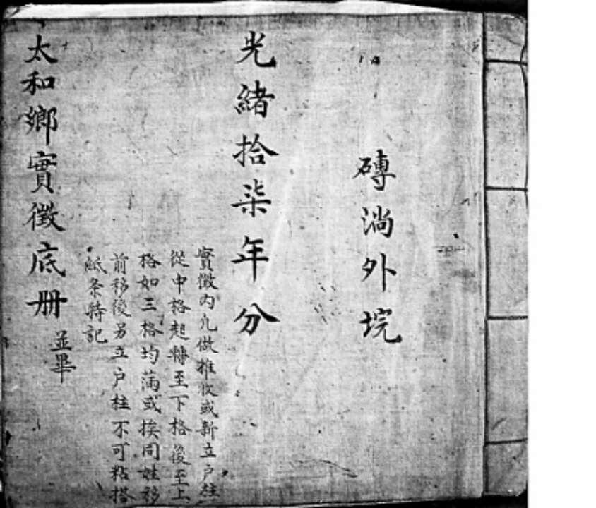 对于清代实征底册的编纂样式,可由湖北省潜江市档案馆收藏之光绪十七年《太和乡实征底册》(实际延续到民国年间)窥其一斑。该实征底册每页载录花户一至四户不等,分为三格,上格第一行直书户名,上注花户身份(绅或民),第二行为编户。中格顶格为印制的粮、艮、米三个红字,分为三行,其下分别记录该户名下应纳粮、银、米数,其左侧下格所记主要为推收及税收变动情形。据鲁西奇、徐鹏飞的初步统计,该实征底册从光绪十八年到民国三十五年间,有着严格的推收记录,因此可以判定该实征底册是作为基层赋税征收的重要依据。