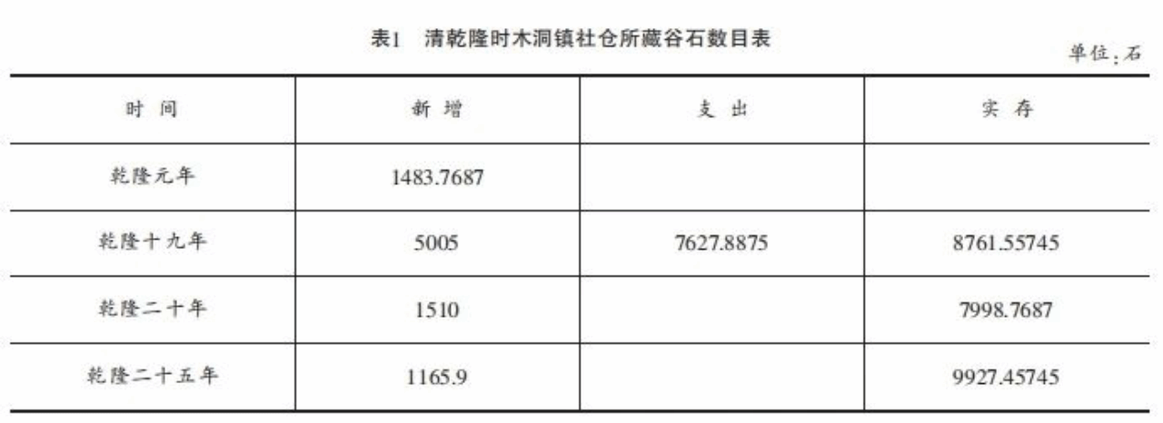 社仓,从官方建仓到“不假手胥役”。乾隆《巴县志》载,“木洞镇社仓四间,乾隆元年巡检邵贤于详请等事案内建仓四间”,该社仓在乾隆元年仅有仓谷千余石,于乾隆十九年前后通过数次绅粮捐输、出借得息等方式,到乾隆二十五年该社仓所贮仓谷一度将近万石。如表1所示。
