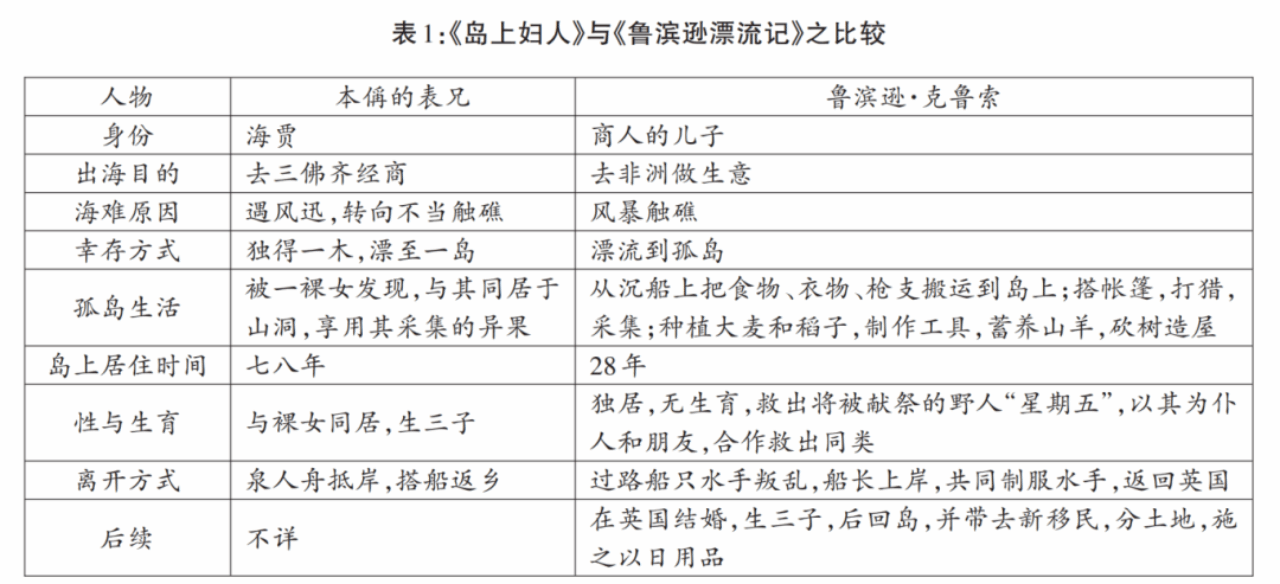 洪迈与笛福生活的年代和地点相去甚远,《岛上妇人》与《鲁滨逊漂流记》篇幅悬殊(前者仅数百字,后者长达二十余万字),其影响天差地别。然而,这两个荒岛奇遇故事有着值得玩味的可比性(见表1)。