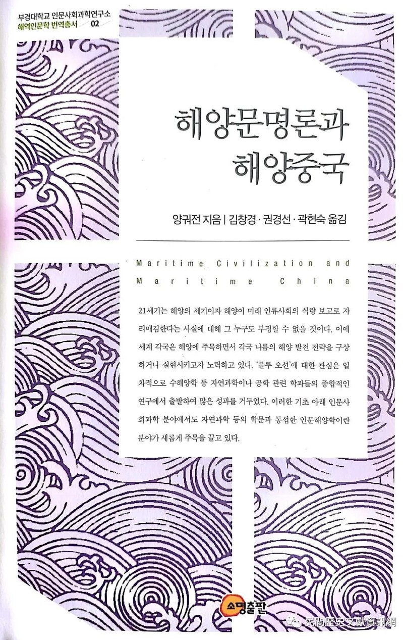 厦门大学人文学院历史系教授杨国桢著《海洋文明论与海洋中国》即人民出版社2016年出版的《中国海洋文明专题研究》第一卷,已由金昌庆、权京仙、郭铉淑译成韩文,并收录进“釜庆大学人文社会科学研究所海洋人文学翻译丛书”,首尔昭明出版社出版发行。